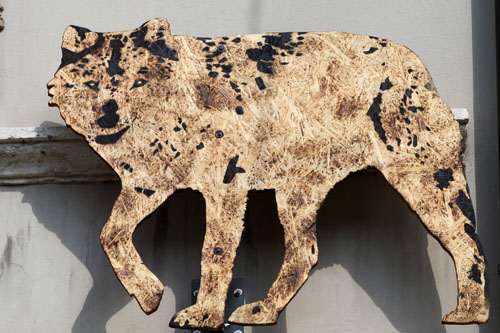 Die Fotomotive der Wildtiere wurden im Unterricht zeichnerisch überarbeitet, auf Karton vergrössert und anschliessend als Schablonen von Hand ausgeschnitten. In der Holzwerkstatt sägten die Schüler die Bildtafeln aus Grobspanplatten. Mit dem Bunsenbrenner wurden die Oberflächen der Holzplatte teilweise angesengt, wodurch eine bräunliche Verfärbung entstand und die Struktur der Holzspäne eine fellartige Anmutung hervorbrachte.