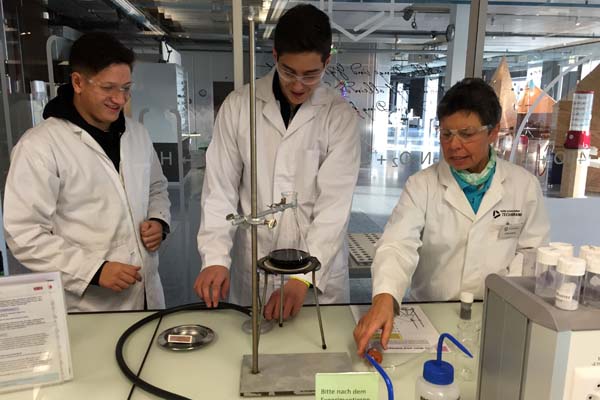 Während die 3d sich mit ihrem Erbgut befasste, beschäftigte sich die 3e mit chemischen Versuchen. Im Labor bekamen Schüler wie Lehrer weisse Mäntel und Schutzbrillen. Dann konnte es losgehen. Nach kurzer Zeit dampfte, zischte und brodelte es. Verschiedene Versuche waren am Laufen. Einer davon war, Rotwein zu destillieren. Zuerst erhitzte man ein Becherglas, das zur Hälfte mit Rotwein gefüllt war mit dem Bunsenbrenner. Nach kurzer Zeit sah man, wie der entstandene Dampf in einem Auffanggefäss zu einer Flüssigkeit kondensierte. Den Nachweis, dass wir es mit reinem Alkohol zu tun hatten, war erbracht, als die Flüssigkeit brannte, als sie angezündet wurde.