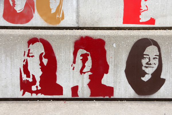 Das Unterrichtsteam Bildnerisches und Technisches Gestalten war gefordert, nach einer neuen Lösung für ein Gesamtkunstwerk zu suchen. Umgesetzt wurde schliesslich die Idee von Simone Hürzeler, die Sitztreppen auf dem Pausenplatz mit stilisierten Portraits der Schüler zu besprayen. Es galt also, von sämtlichen Schülern der KSU ein Foto mit seitlichem Lichteinfall zu schiessen, mit Photoshop das Ganze zu bearbeiten und die laminierten Ausdrucke so auszuschneiden, dass sie als Schablone für das Sprayen verwendet werden konnten. Den Schülern stand eine Farbauswahl zur Verfügung, die sich bewusst an die Rostfarbe des gegenüberliegenden Würfels anlehnt. Auch dieses Das Projekt „Treppengraffiti“ist nicht minder aufwendig als das Würfelprojekt, aber mit der tatkräftigen Unterstützung der vielen Schüler einmal mehr zu schaffen. Es war eine Freude zuzusehen, wie das Projekt nach diversen Spraylektionen immer mehr Gestalt annahm und die Schüler in der Pause einander zeigten, an welcher Stelle sie verewigt wurden.