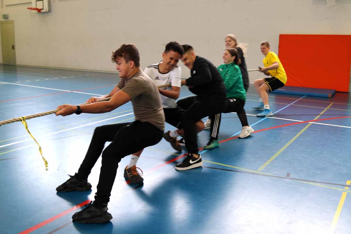 Die Schüler wurden über alle Jahrgänge, Klassen und Geschlechter durchmischt in Gruppen eingeteilt, die sich zum Beispiel in Geschicklichkeit massen. Beim Turmbau mit Zeitungspapier oder zu dritt auf Skiern festgebunden auf einem Parcours waren vor allem Koordination und Kollaboration gefragt. Ebenfalls beim Volleyball mit Tüchern als Katapulte war ein gutes Zusammenspiel gefragt. Selbst auf der Slackline und bei der Pedalo-Stafette durften sich die Schüler gegenseitig etwas unterstützen. Das Torwandschiessen mit Handbällen wäre wohl auch einfacher gewesen, wenn nicht jeweils zwei Schülern die Hände zusammengebunden worden wären. So wurde auch gewertet: Punkte gab es für gute Integration aller in die Gruppe oder auch für eine gute Gruppendynamik.