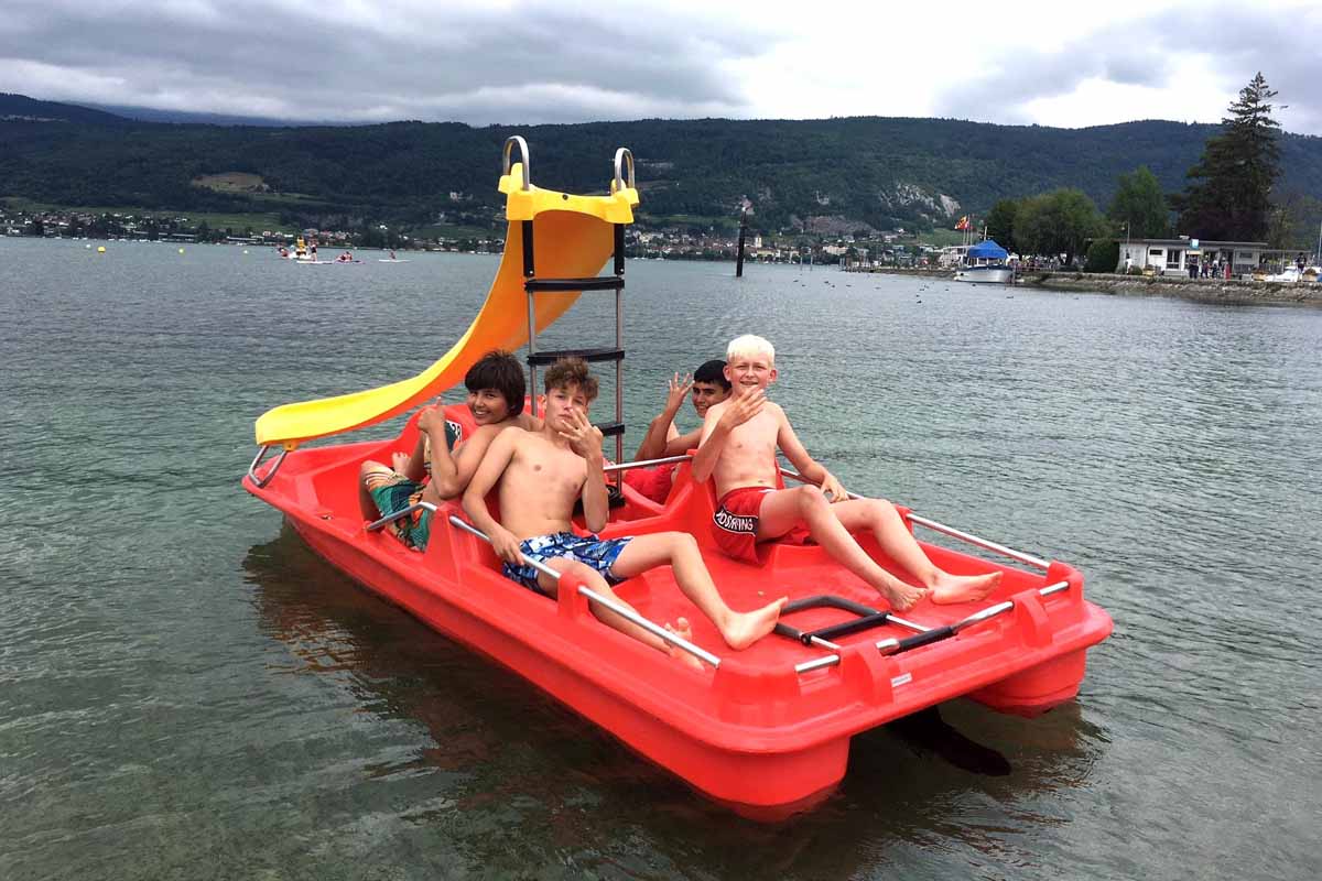 In ähnlichen Gefilden war die 1d unterwegs, die allerdings mit dem Schiff von Biel zur St. Peters-Insel fuhr und nach einer leichten Wanderung in Erlach ebenfalls im Bielersee ein Bad nahm. Die kühlen Temperaturen lockten erstaunlich viele ins Wasser, bzw. mieteten einige Pedalos, auf denen die eingebaute Wasserrutsche für Unterhaltung und Action sorgte.